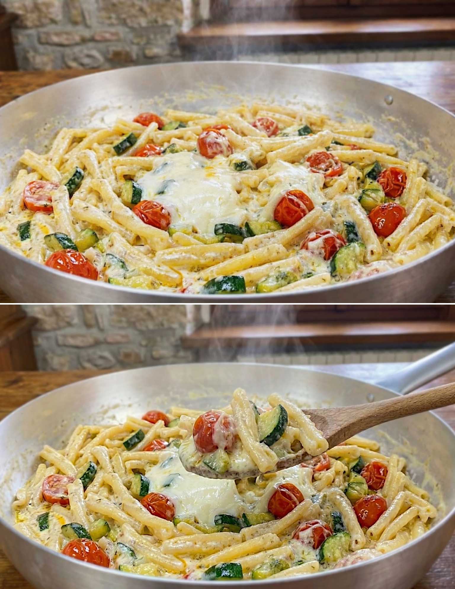 Questa è la classica pasta che nasce senza pensarci troppo. Zucchine, pomodorini, un po’ di cipolla e alla fine una cucchiaiata abbondante di Philadelphia che lega tutto. È veloce, profuma di verdure e viene bella cremosa senza bisogno di panna.
